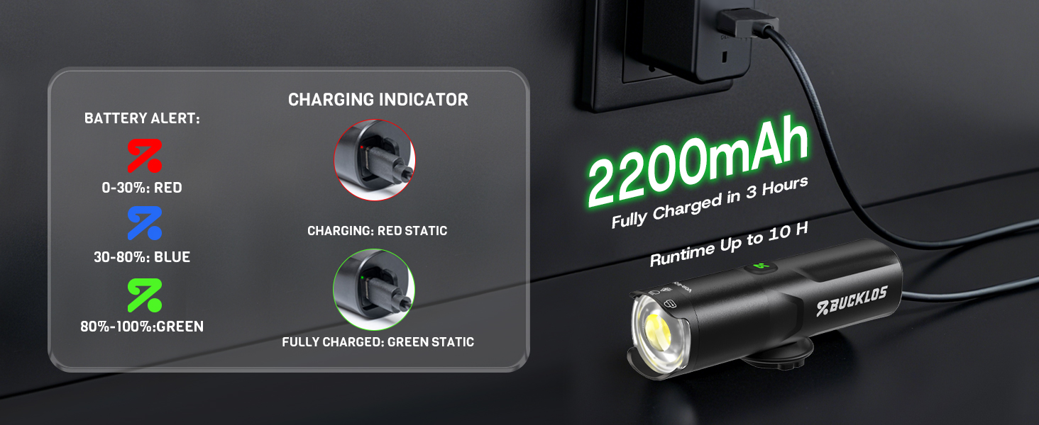 Enhanced Charging Efficiency: As a headlight for bikes riding at night, this rechargeable bike headlight charge fully in 2.5 hours via dual USB-C. The headlights 2500 mAh battery lasts 13h power on flash mode