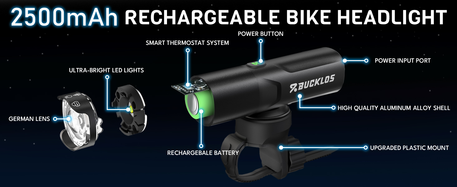 BUCKLOS 400/600/800 Lumen bike headlight with 6 modes, 2000/2200/2500mAh battery