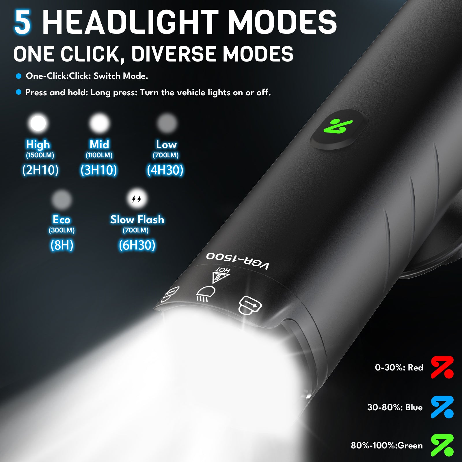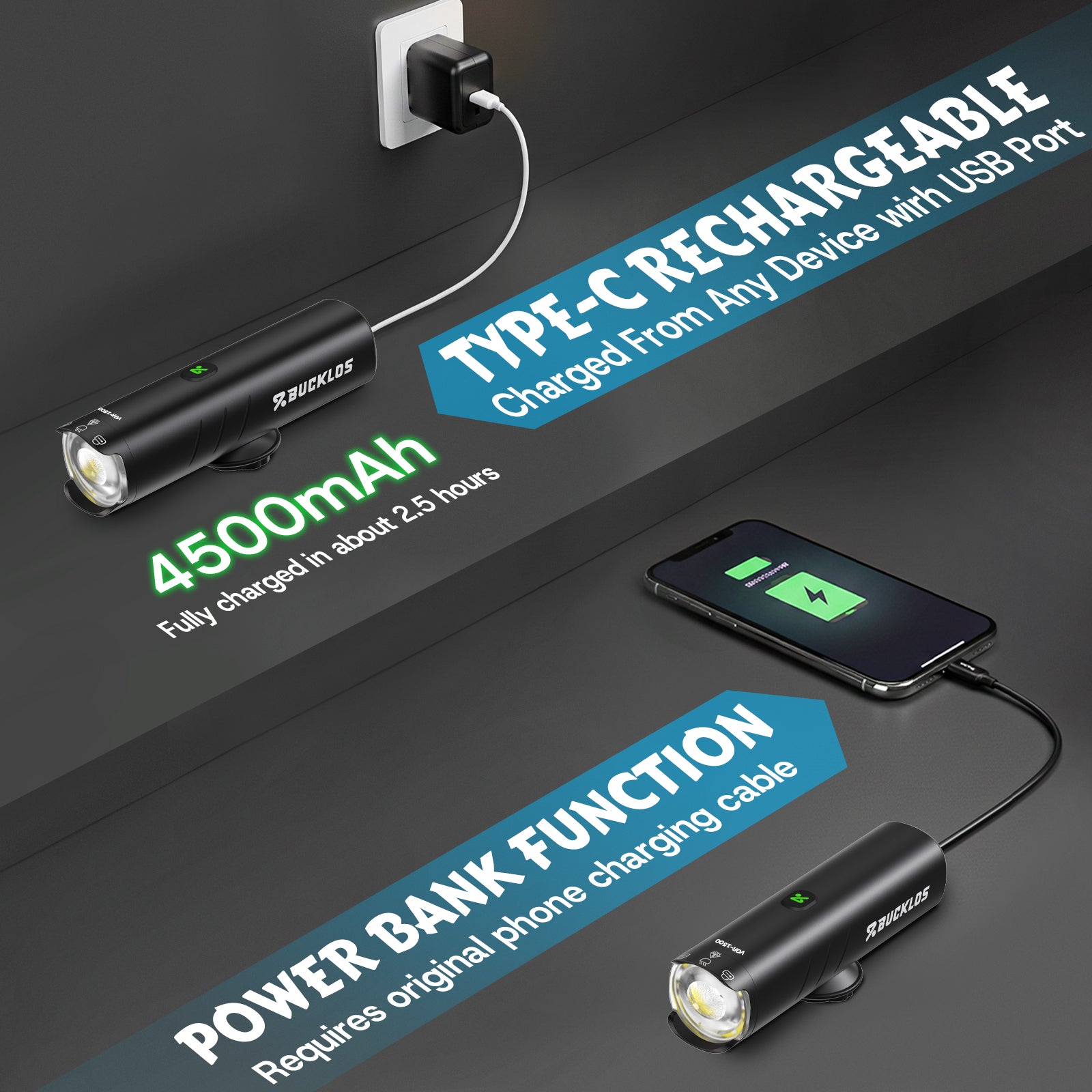 Enhanced Charging Efficiency: As a headlight for bikes riding at night, this rechargeable bike headlight charge fully in 2.5 hours via dual USB-C. The headlights 4500 mAh battery lasts 8h power on flash mode