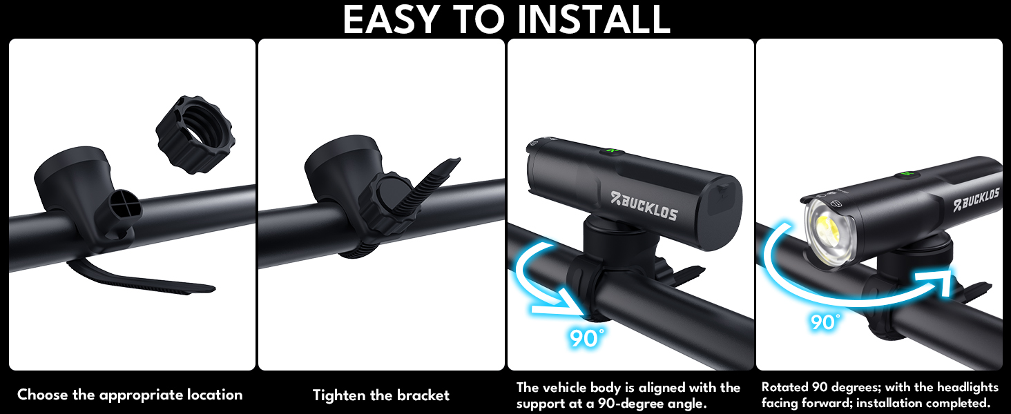Easy to Install: Bucklos LED Bike headlight kit tool-free silicone straps, can securely clip to handlebars. Attention: Press the power button 5 times in a row or plug in to unlock and turn on the device.