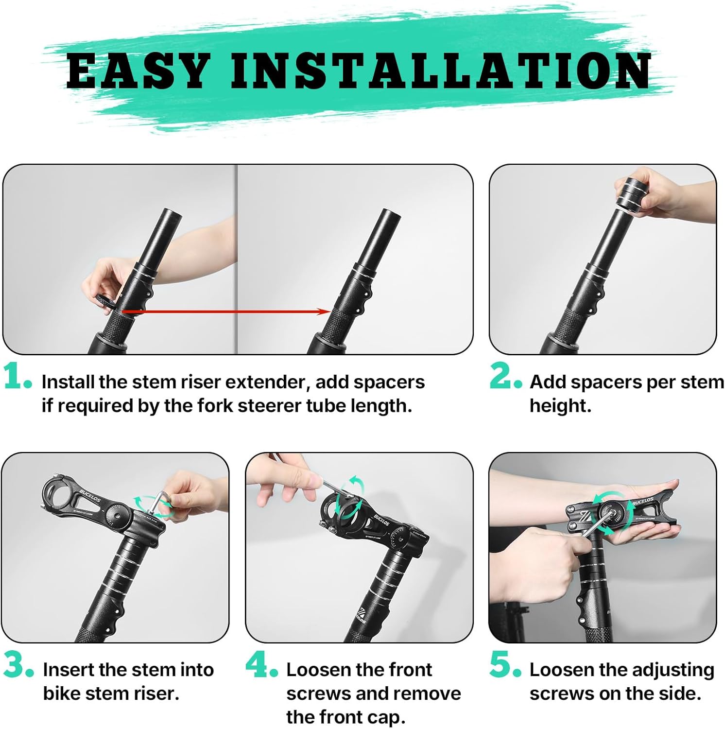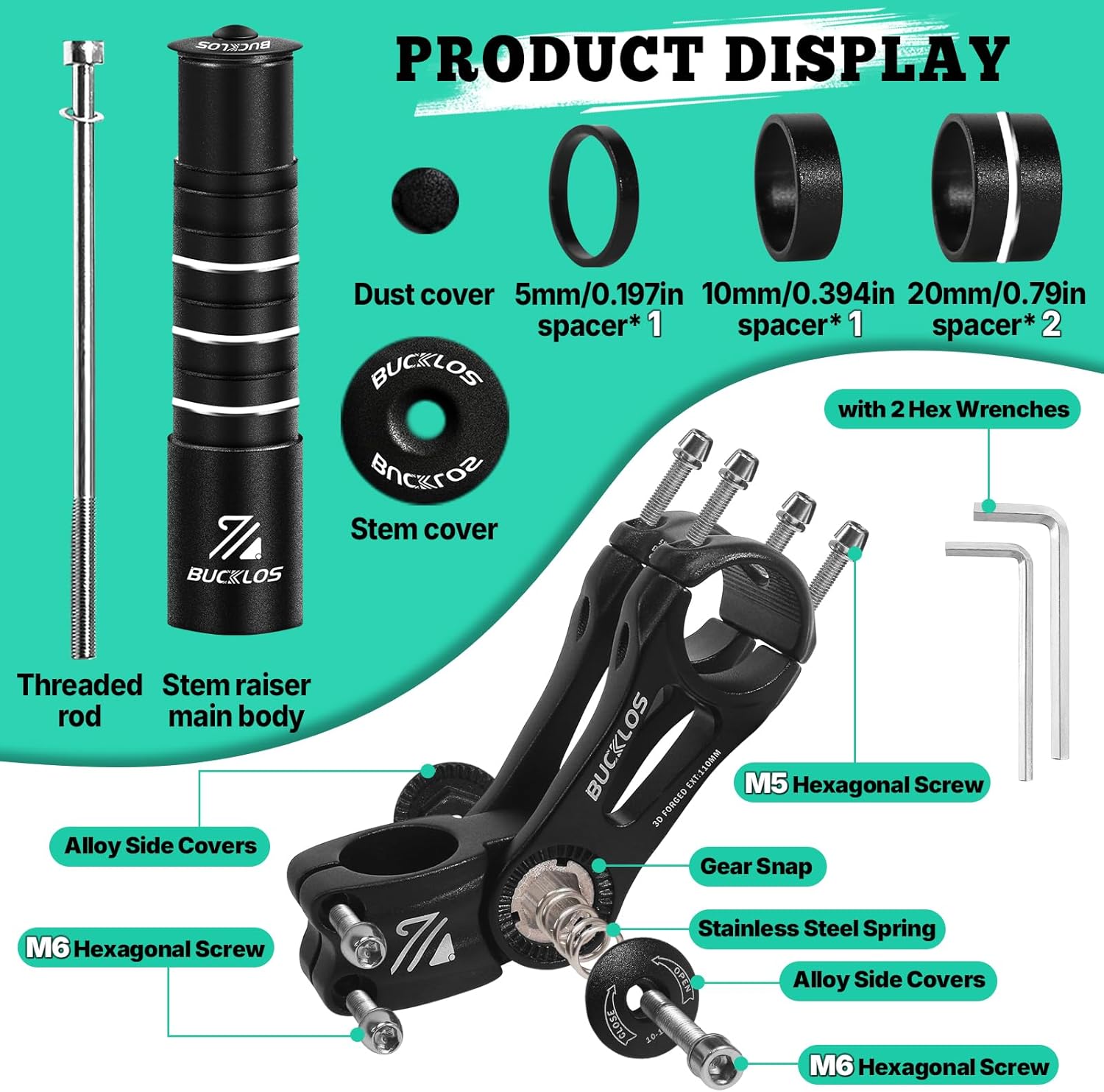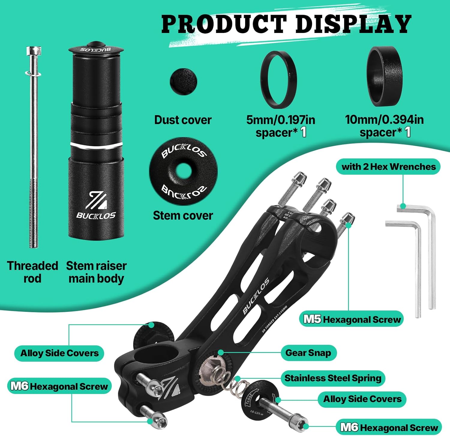 Package Includes: Adjustable bike stem*1, stem raiser main body*1, threaded rod*1, stem cover*1, dust cover*1, include 4 Spacers, 2 x 20 mm; 1 x 10 mm; 1 x 5 mm, hex wrenche*2