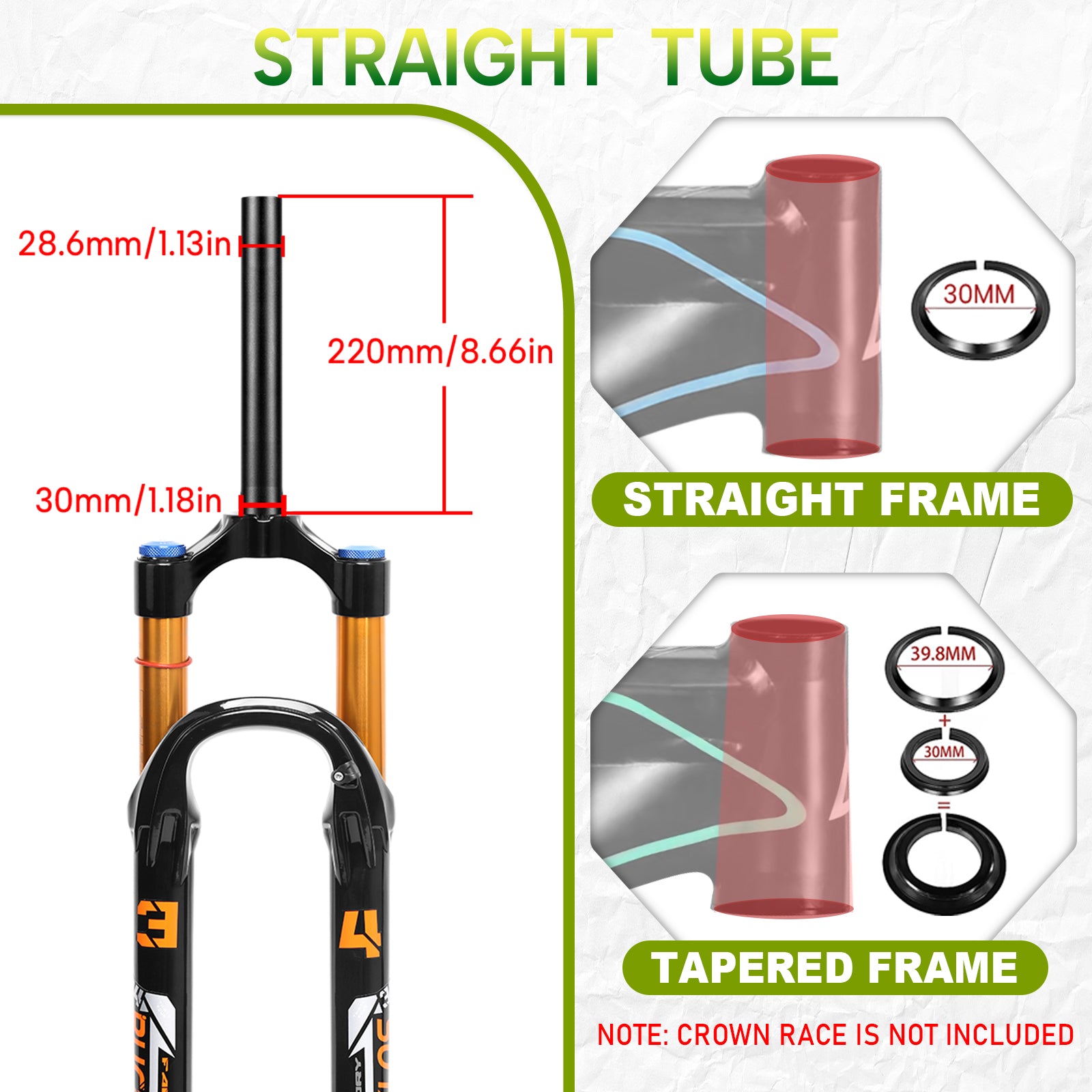 30mm crown race,steerer tube (28.6mm threadless), and disc brake adaptors. Compatible with 26/27.5"/29" wheels and 180mm direct mount 203mm rotor adapter.