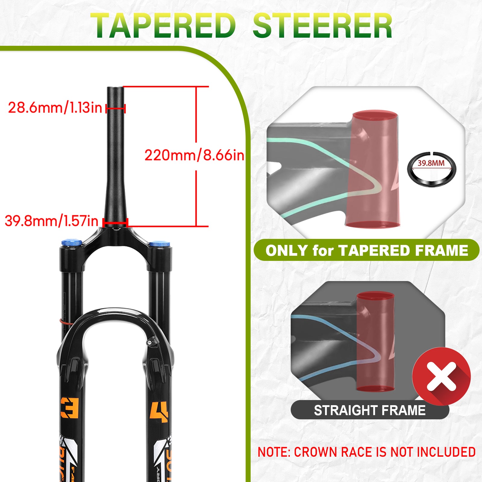 30mm crown race,steerer tube (28.6mm threadless), and disc brake adaptors. Compatible with 26/27.5"/29" wheels and 180mm direct mount 203mm rotor adapter.