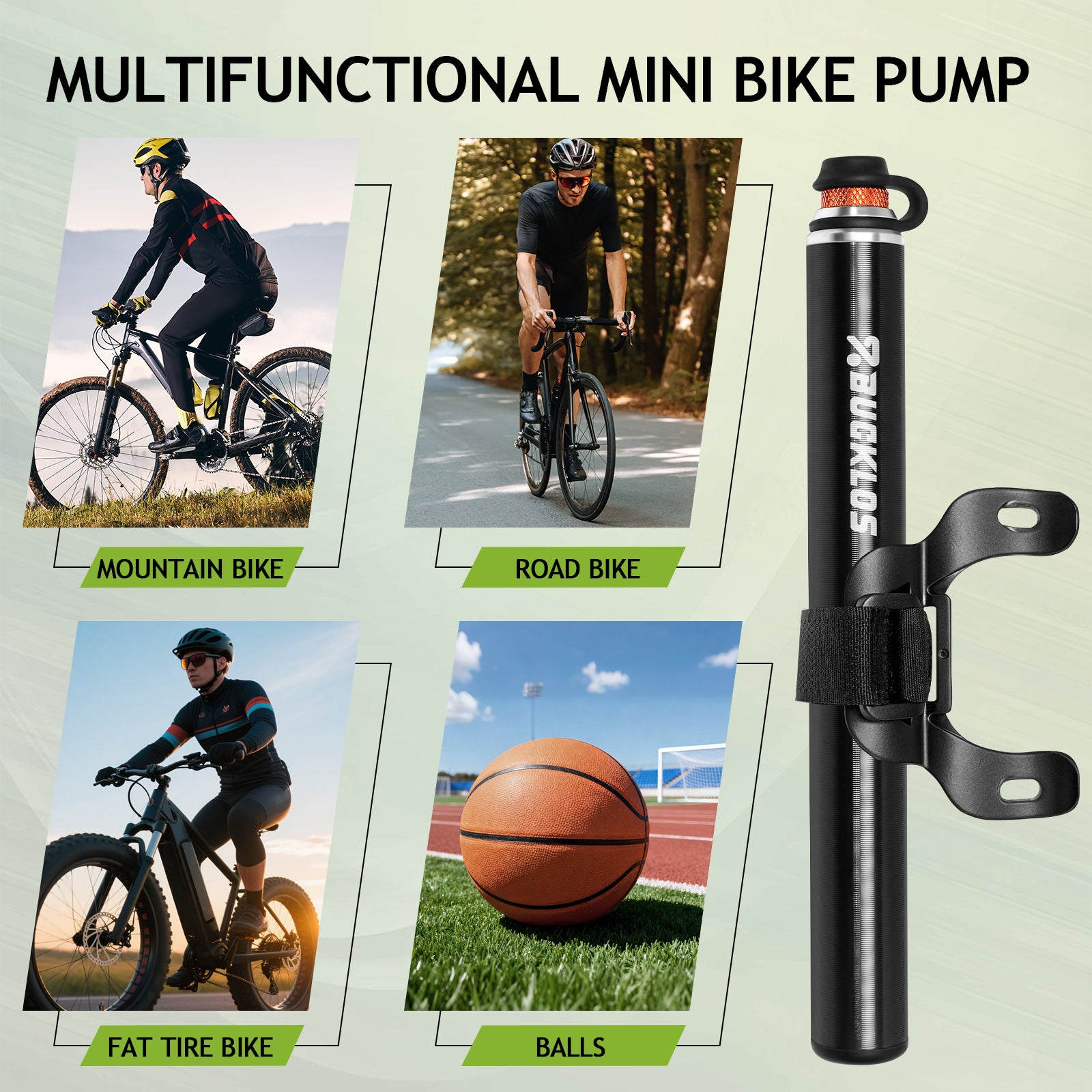 Sturdy & Comfortable: The mini bike tire pump is made of AL-6063 aluminum alloy, balancing light weight and sturdiness. This portable bike pump's surface is added with anti-slip texture for a more stable grip, ensuring safe and labor-saving inflation