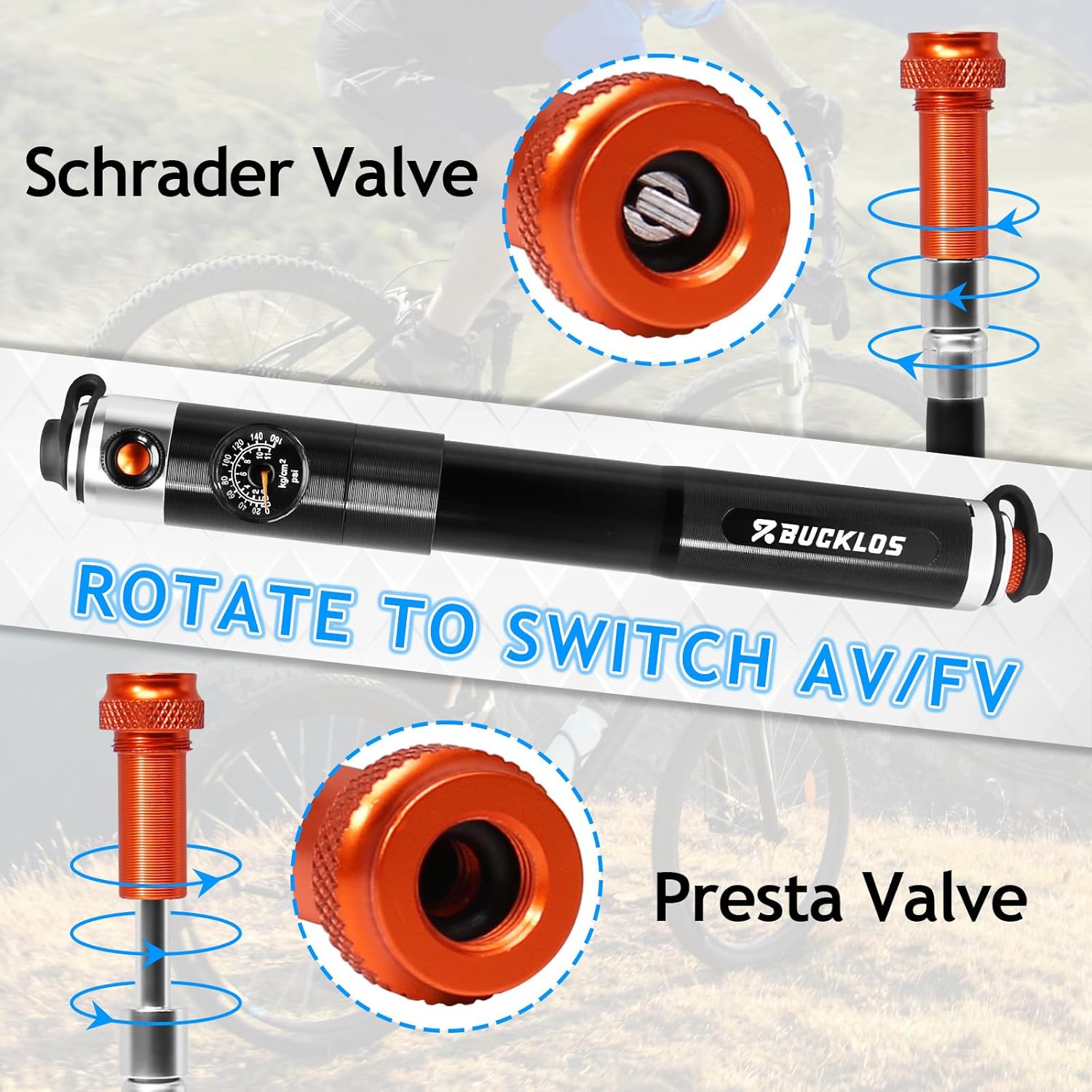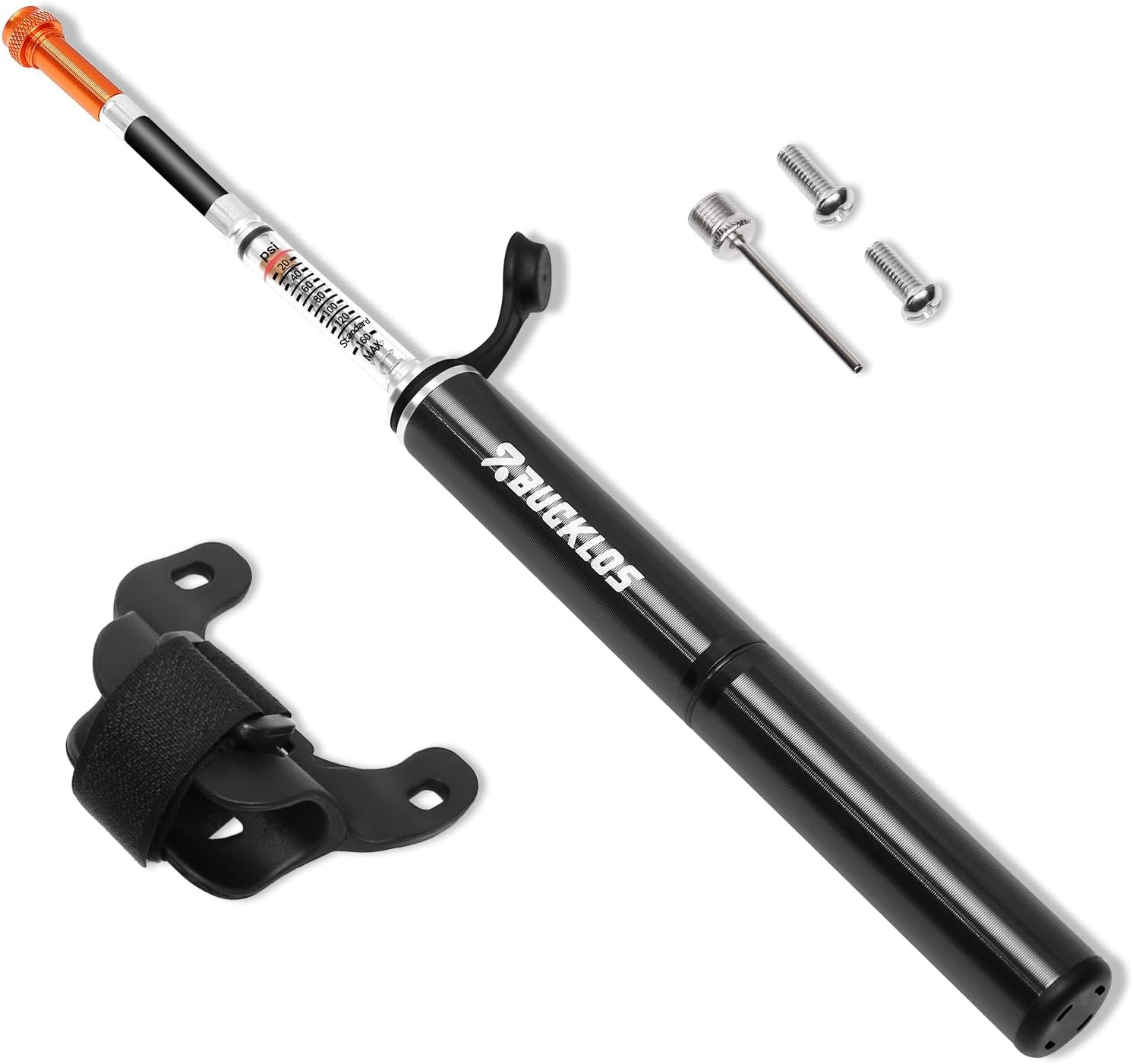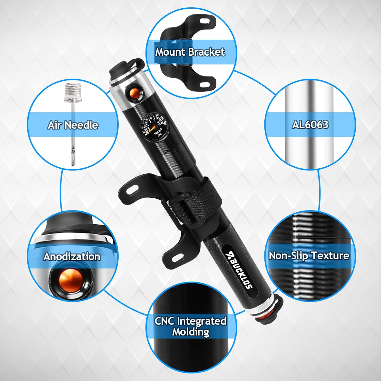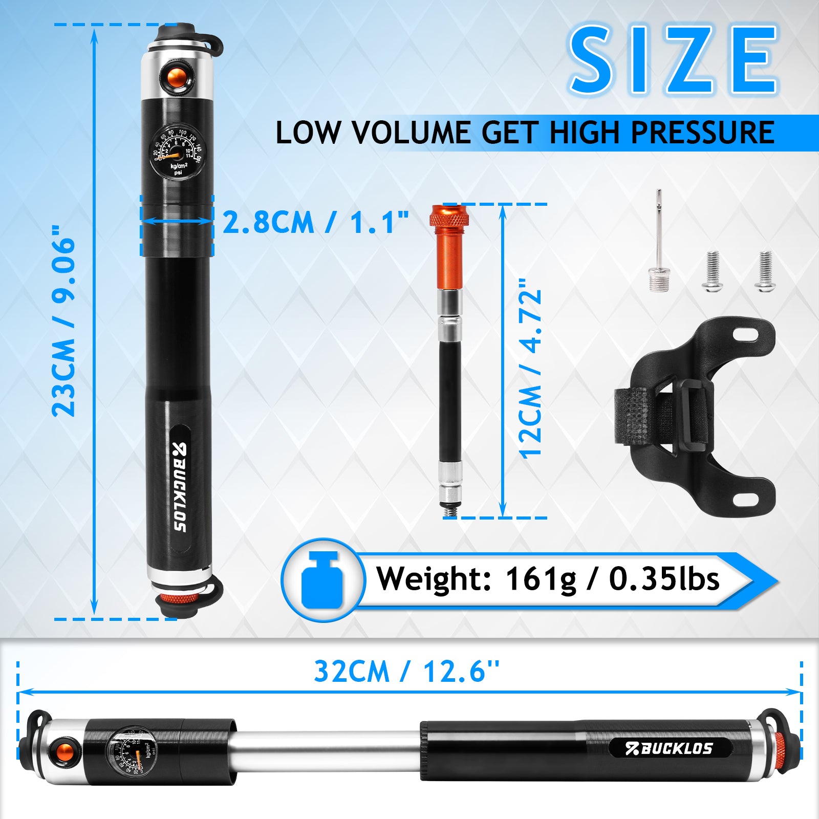 Lightweight & Portable: BUCKLOS mini bike pump with gauge is 23cm long and only 161g, compact and light. The hand tire pump can be easily put into a backpack or on a bike frame, with no burden to carry around