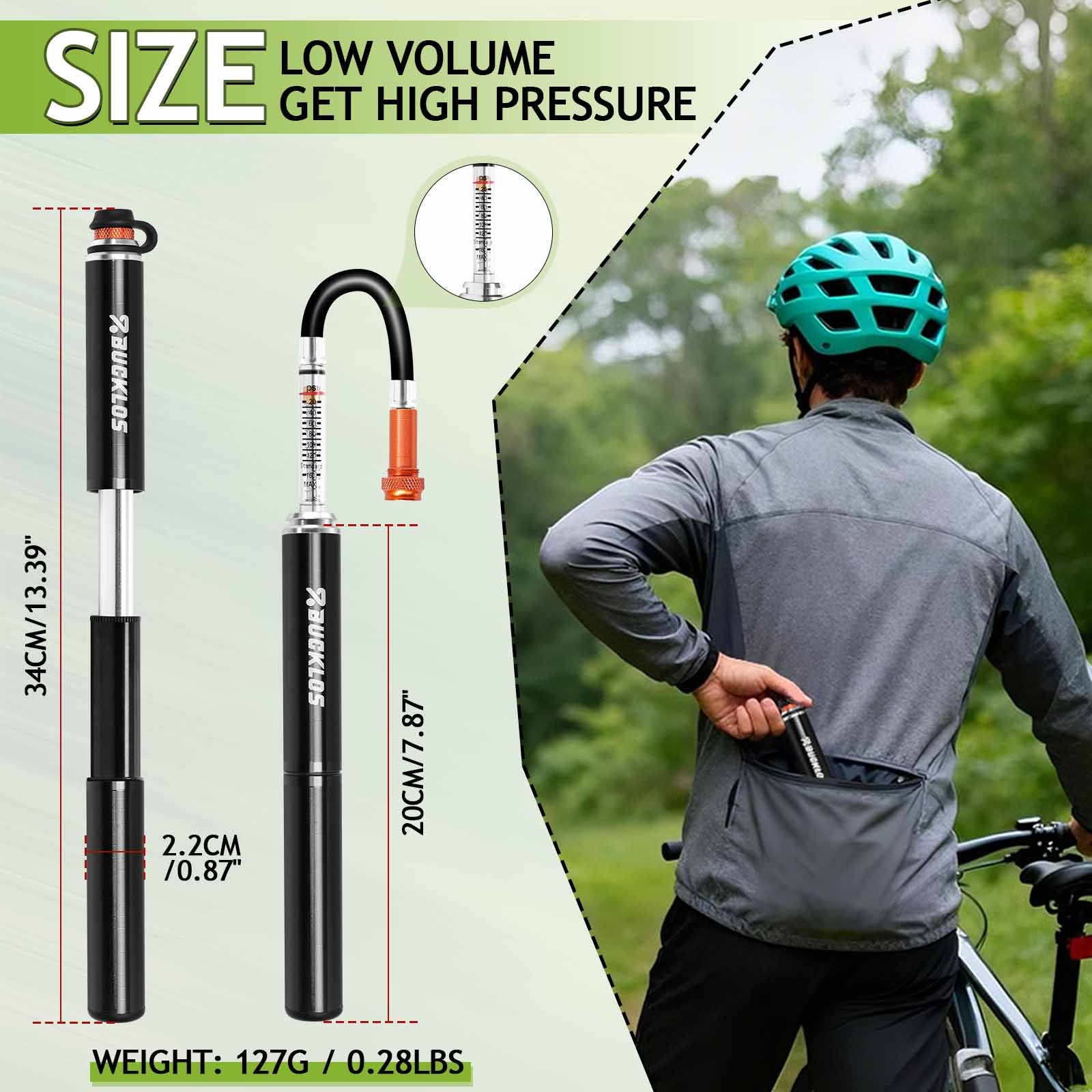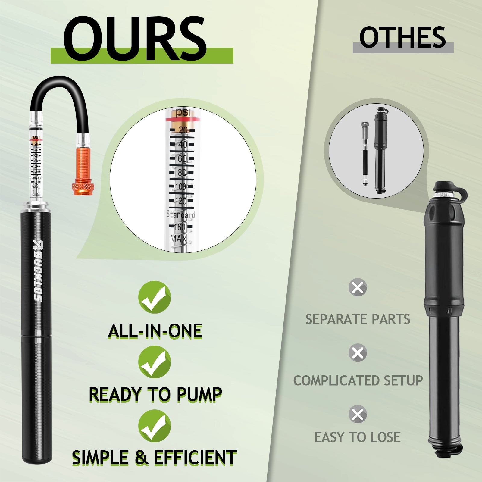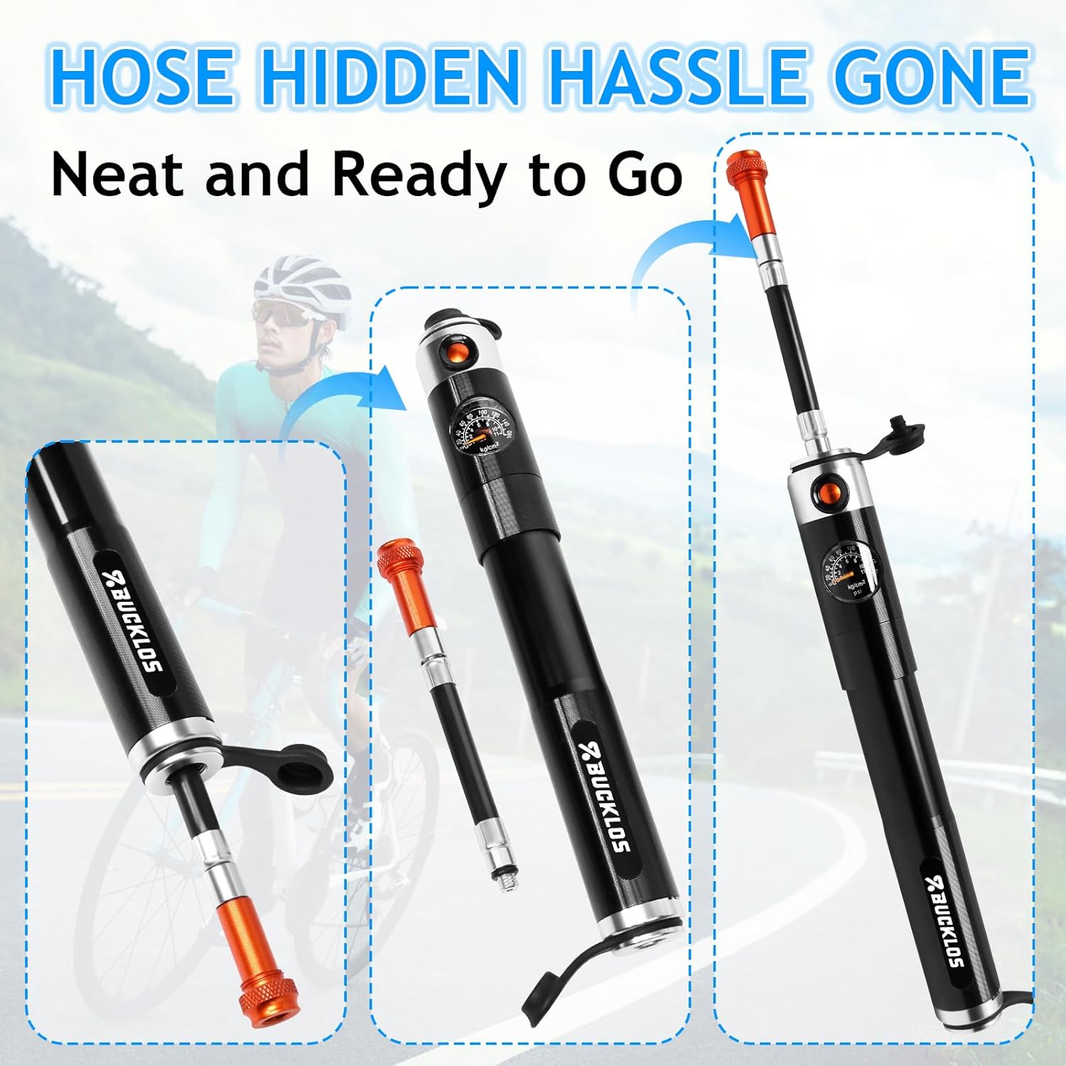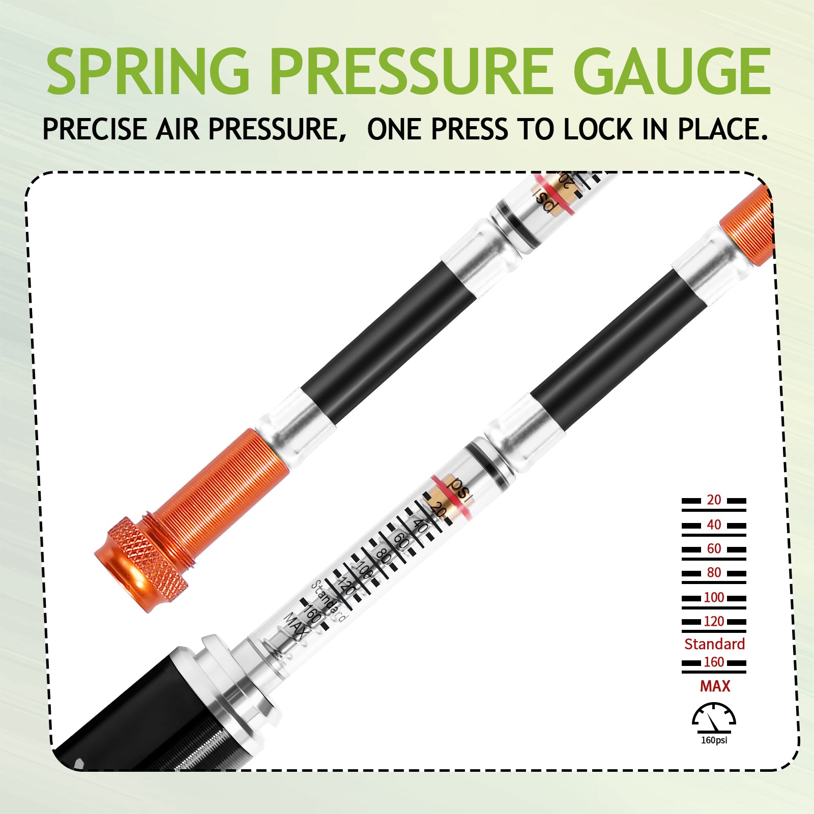 Compact & Efficient: This bicycle tire pump is equipped with an air pressure gauge and supports a maximum pressure of 160psi. The hand bike pump stores the inflation hose at its base, ensuring neat storage and hassle-free portability
