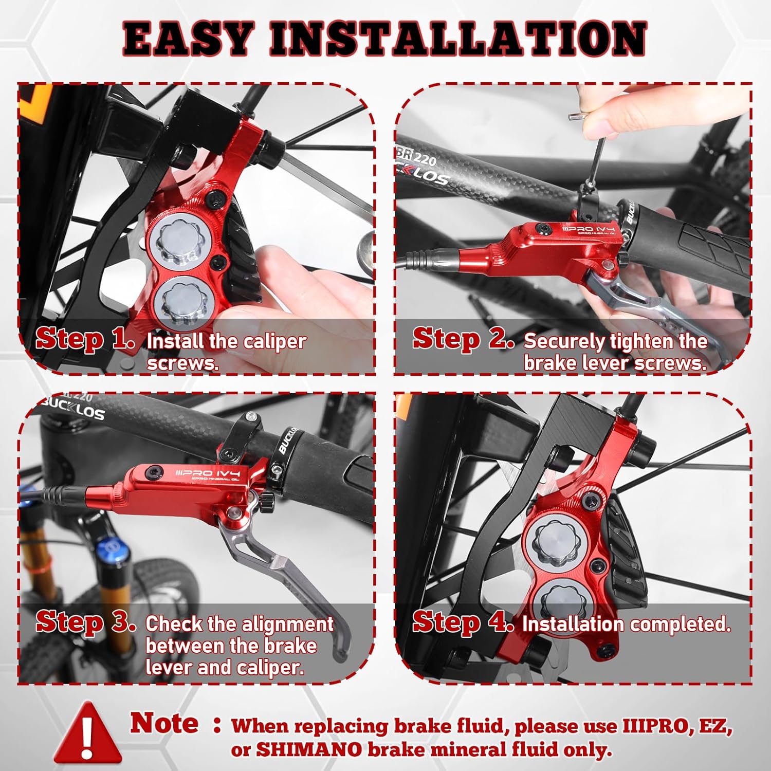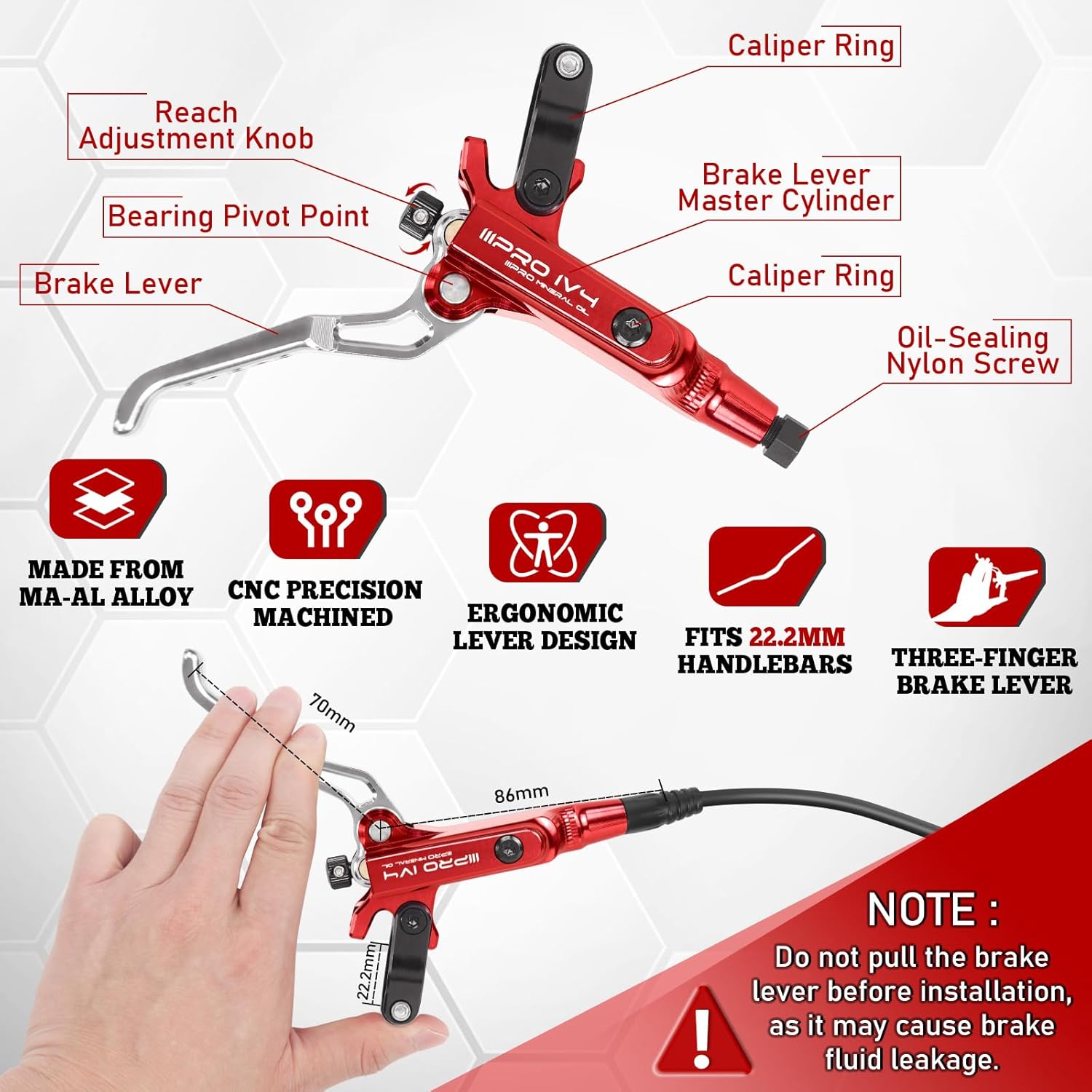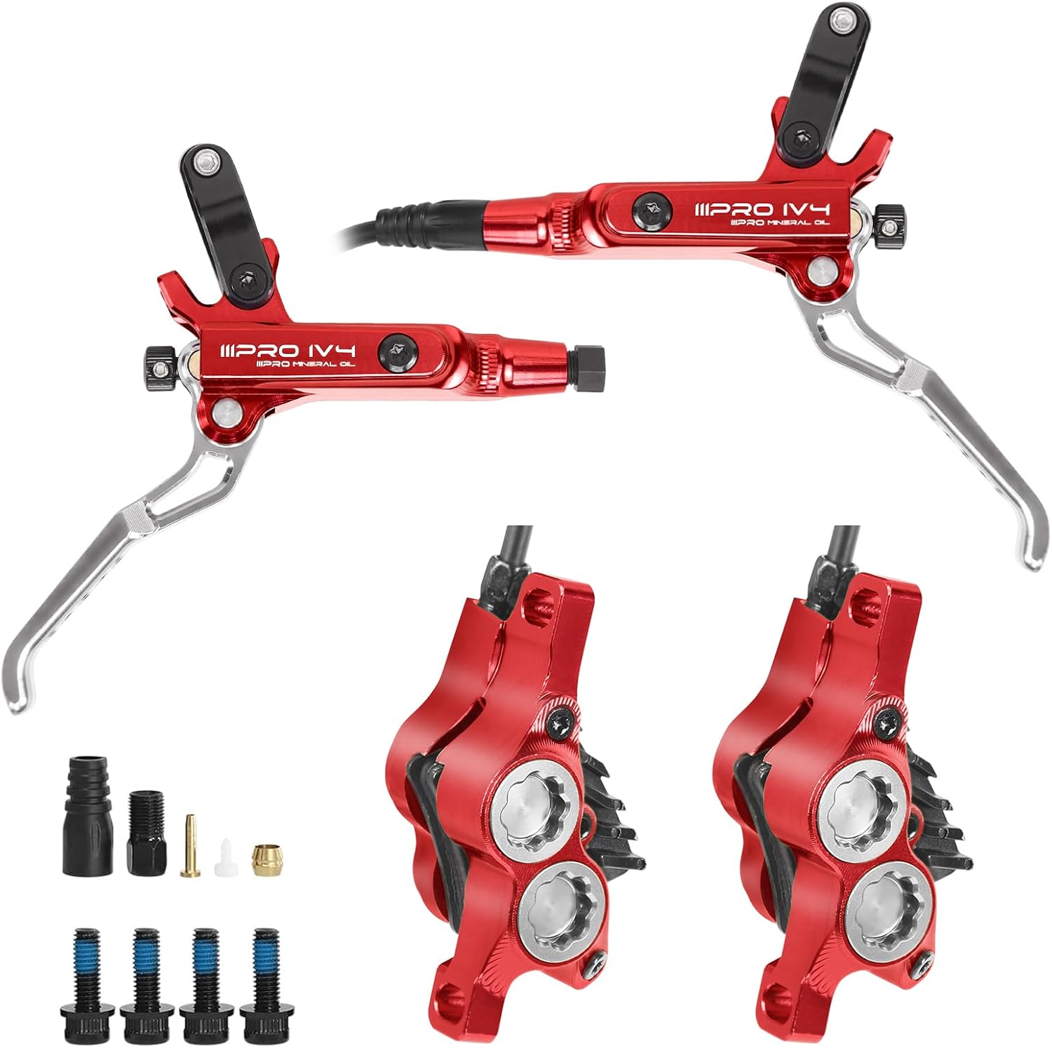 2025 IIIPRO IV4 4-Piston MTB Hydraulic Disc Brake Set Front 850mm and Rear 1550mm Fit Ebike Fat Bike Trail Bicycle XC AM DH BMX(Red)