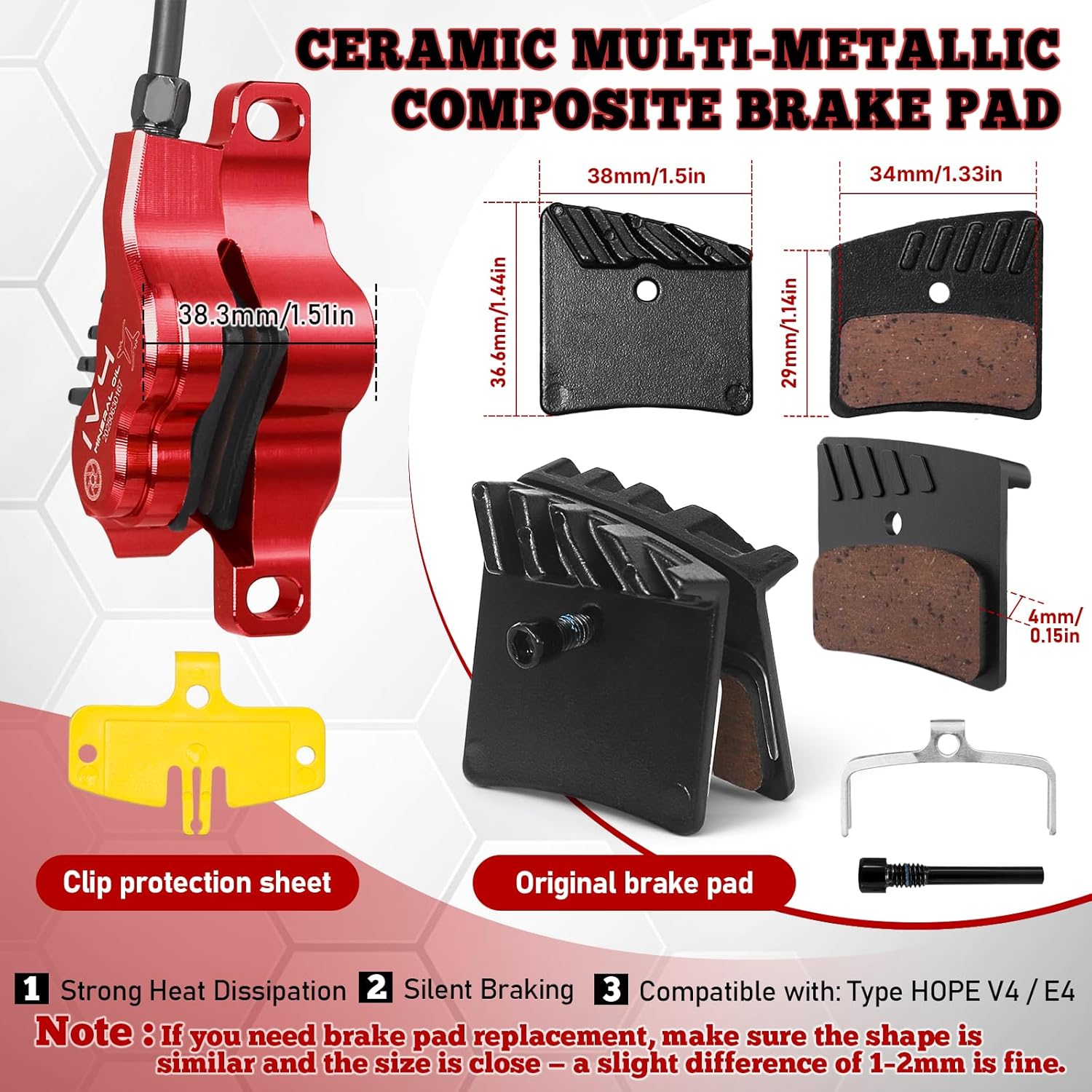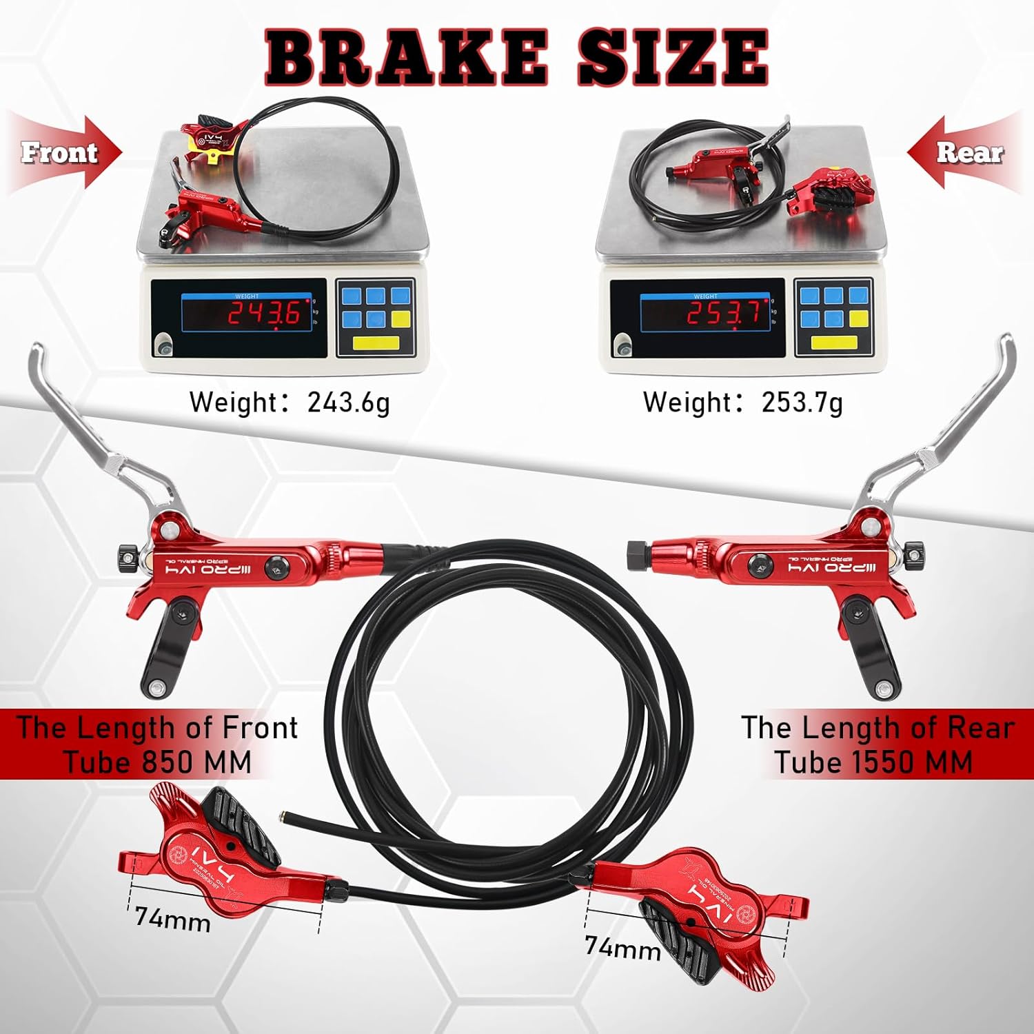 4. Easy Maintenance:Compatible with Hope V4/E4 brake pads, uses high-performance mineral oil for smoother braking and easier maintenance.Front brake is 850mm, rear brake is 1550mm