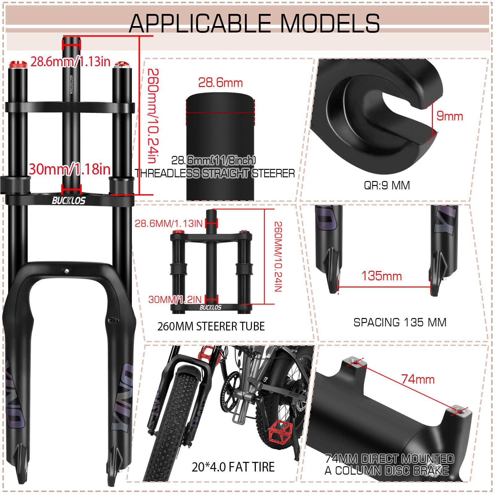 【Light weight】This fat tire MTB air suspension fork is made of advanced magnesium+aluminum alloy fork legs and imported air rods. Its weight is only 2645g (?? 50g), which is about 1.8lbs lighter than the oil spring fork (which is about the weight of 1 bottles of 800ml water). It reduces the weight of the bike to the greatest extent, allowing you to play more easily and faster on the snow or beach.