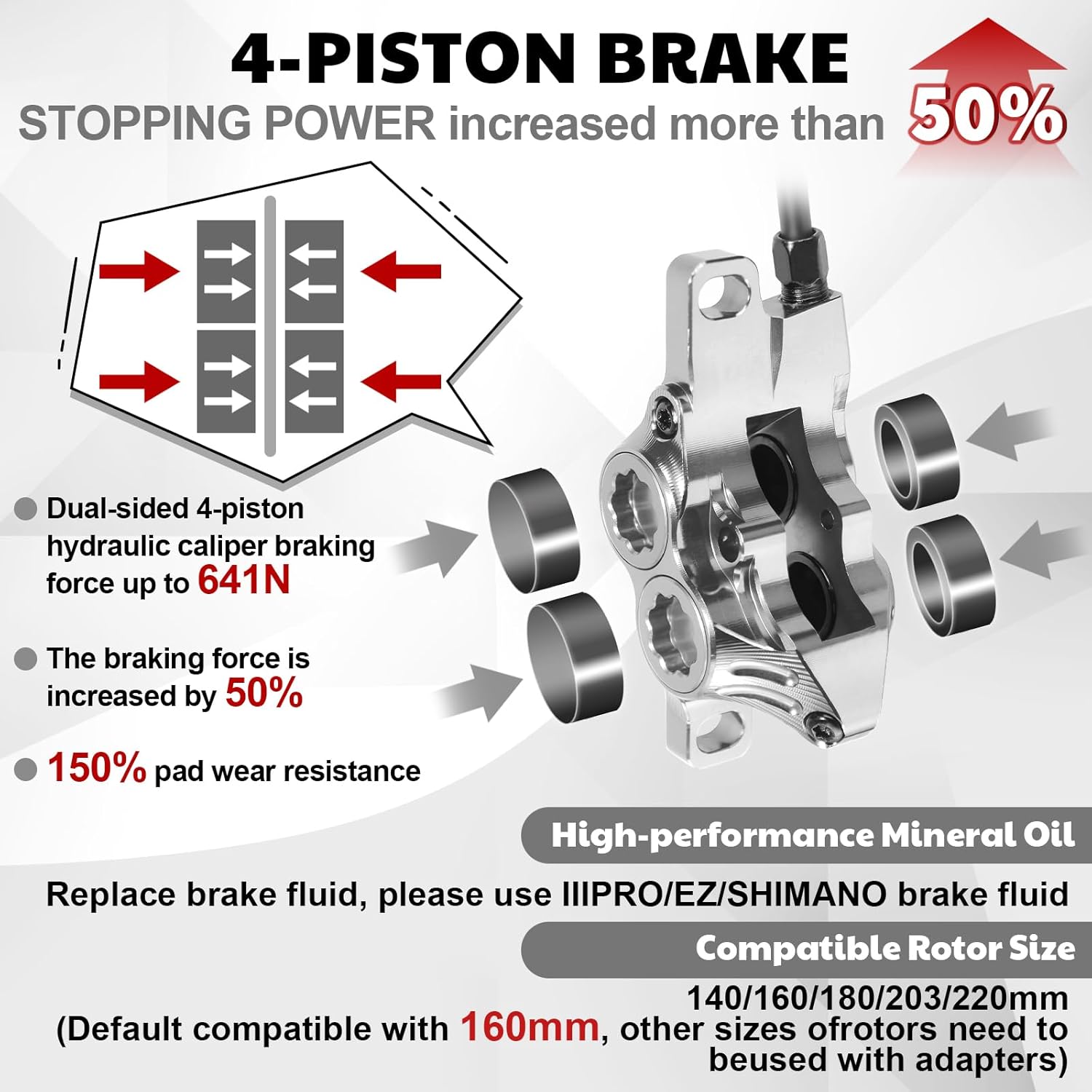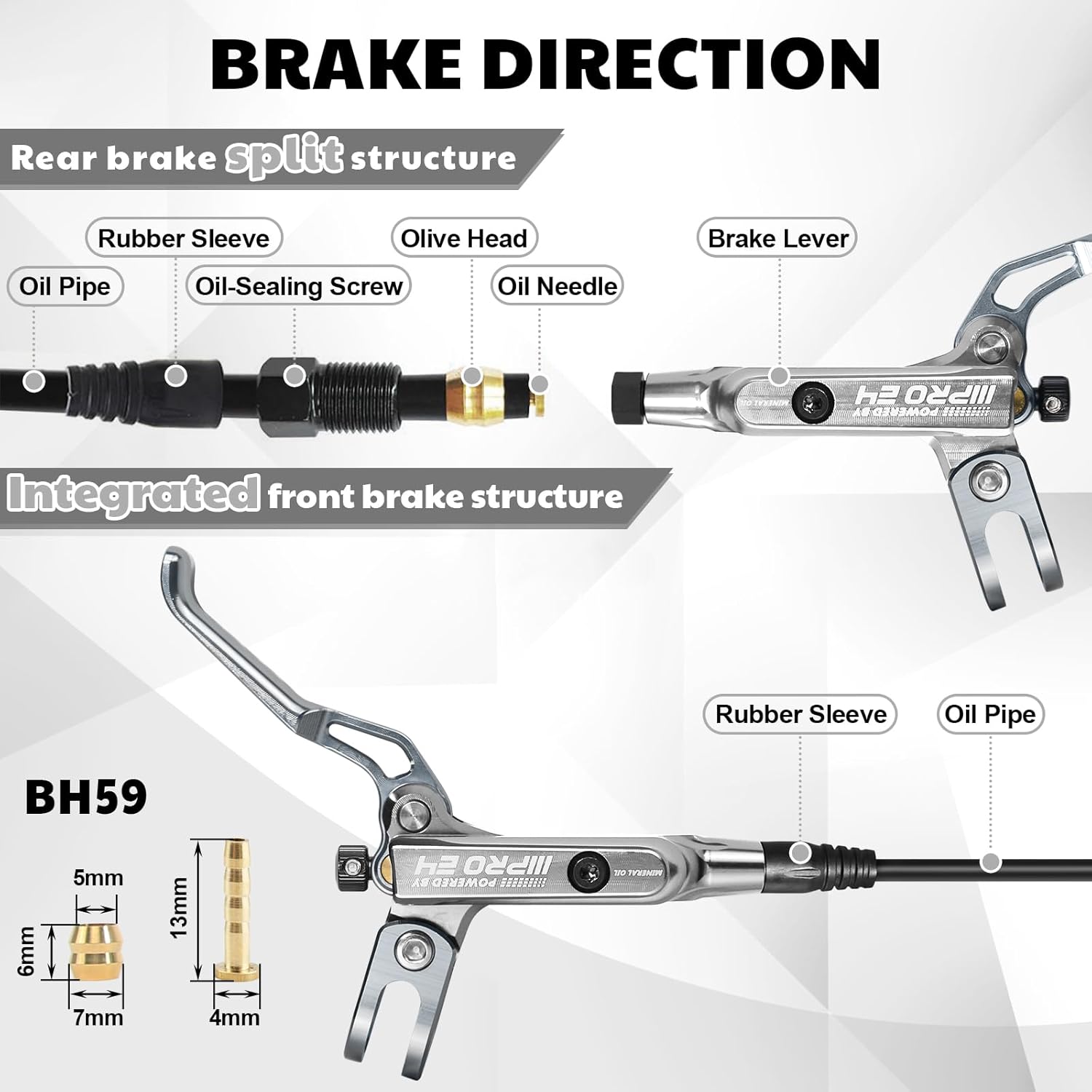 Brake Size: For this hydraulic brakes set, left side controls the front, right side controls the rear, fits the habit of most people cable of front is 835 mm, cable of rear is 1550 mm